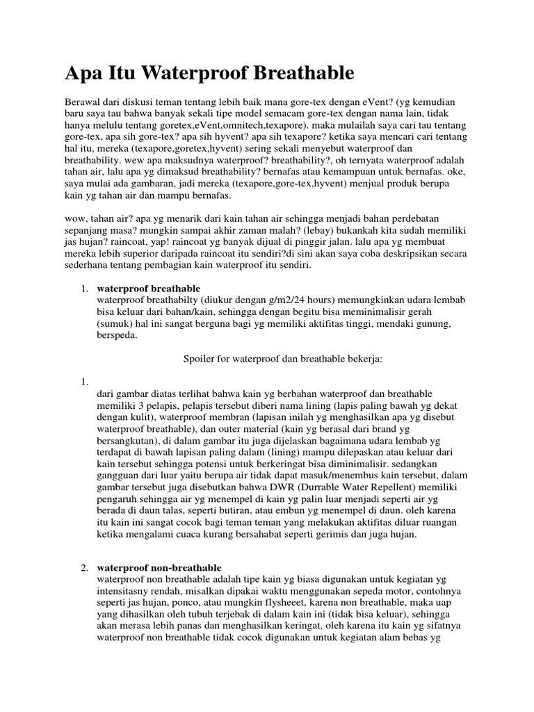 Apa Itu Waterproof Breathable - Sedangkan, gizi yang bermanfaat bagi tubuh seperti yang mengandung makanan bergizi itu tidak perlu dan tidak selalu mahal, tapi harus sehat dan bergizi yang juga mengandung berbagai zat yang bermanfaat bagi.